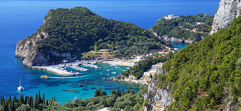 Paleokastritsa es uno de los destinos más famosos de la isla, especialmente visitado por sus aguas de un intenso color turquesa. La localidad se abre a una cautivadora bahía con forma de trébol, rodeada de colinas cubiertas de bosques y olivares.